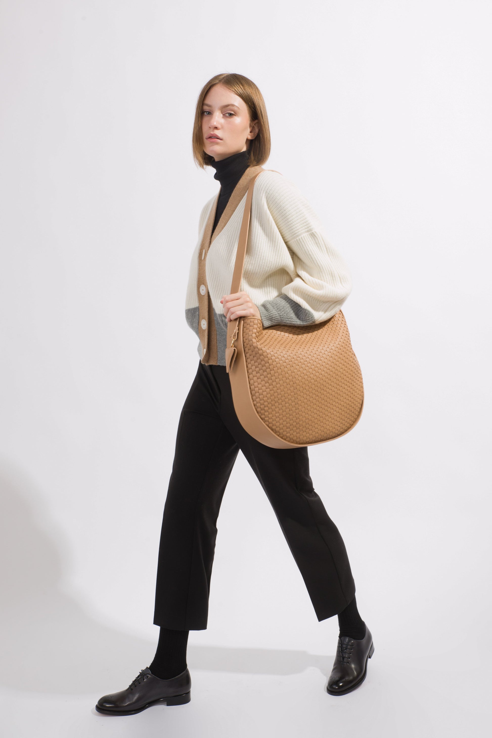 Hobo with a rigid profile of reinforced leather. The handle is adjustable. It is closed with a magnet placed centrally. This kind of closure is the best for this bag, because of the particular frontal fold, so as to guarantee perfect adherence. The plain leather bottom facilitates cleaning and maintenance.- 100% Made in Italy