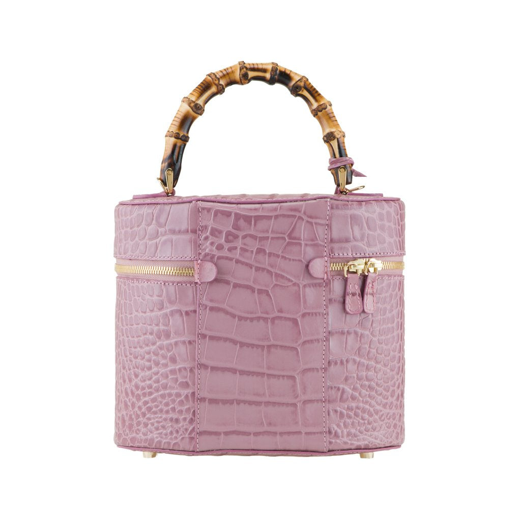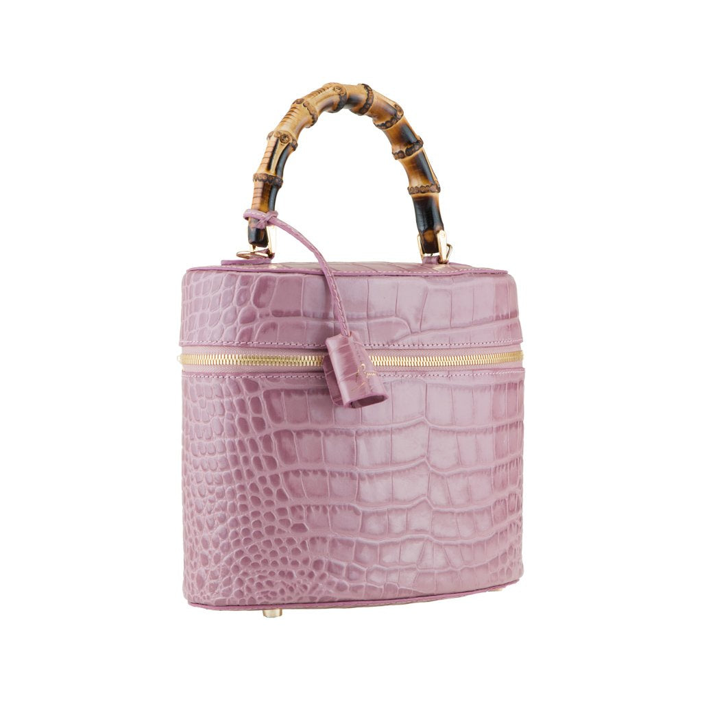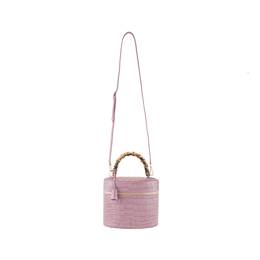 Bellezza is a croc-embossed calfskin bucket bag crafted by the talented artisans of Buti in Tuscany. With its cylinder shape and different textures, this beauty is truly one of a kind. Wear by the bamboo handle, or attach the strap for an effortlessly chic look.