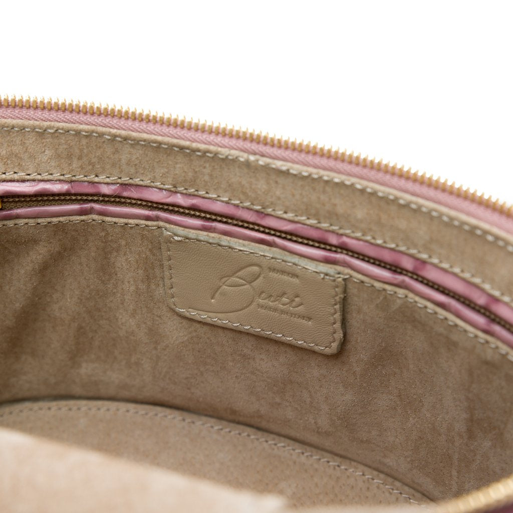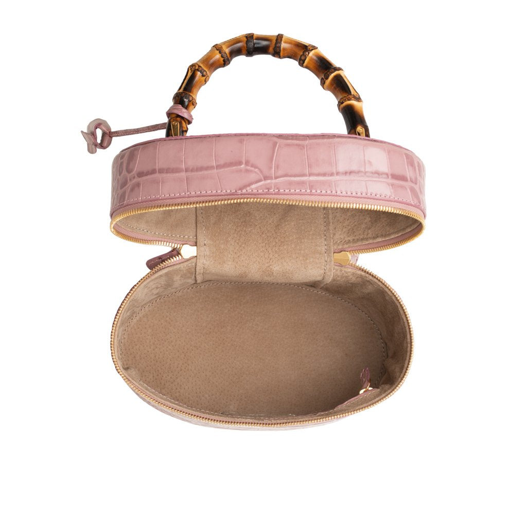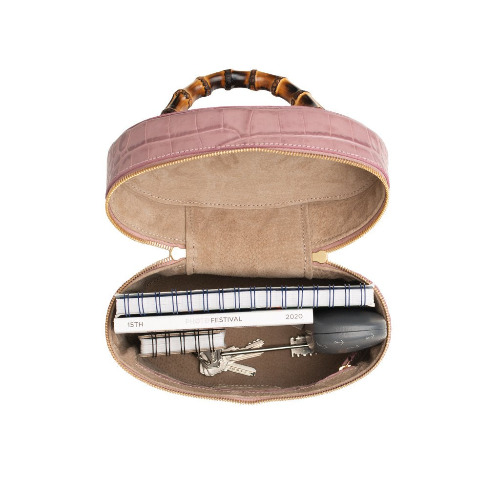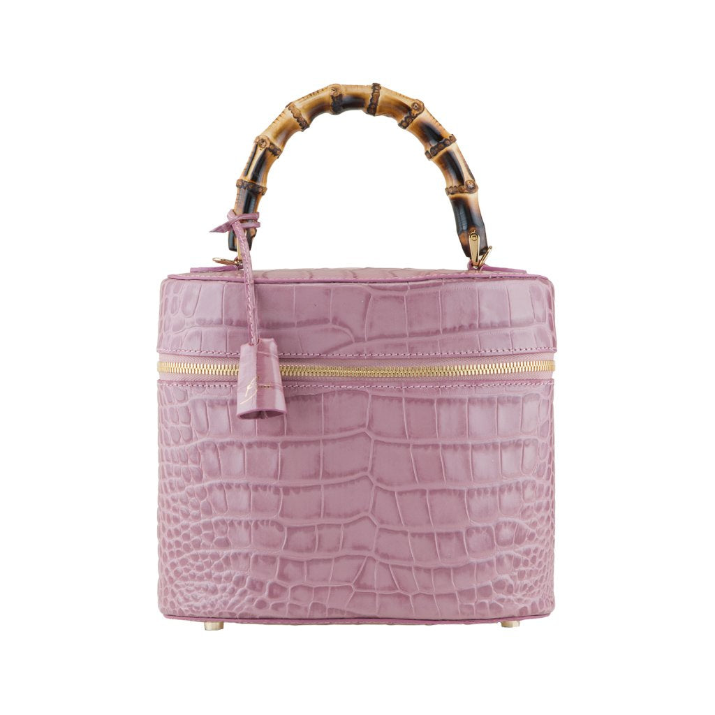 Bellezza is a croc-embossed calfskin bucket bag crafted by the talented artisans of Buti in Tuscany. With its cylinder shape and different textures, this beauty is truly one of a kind. Wear by the bamboo handle, or attach the strap for an effortlessly chic look.