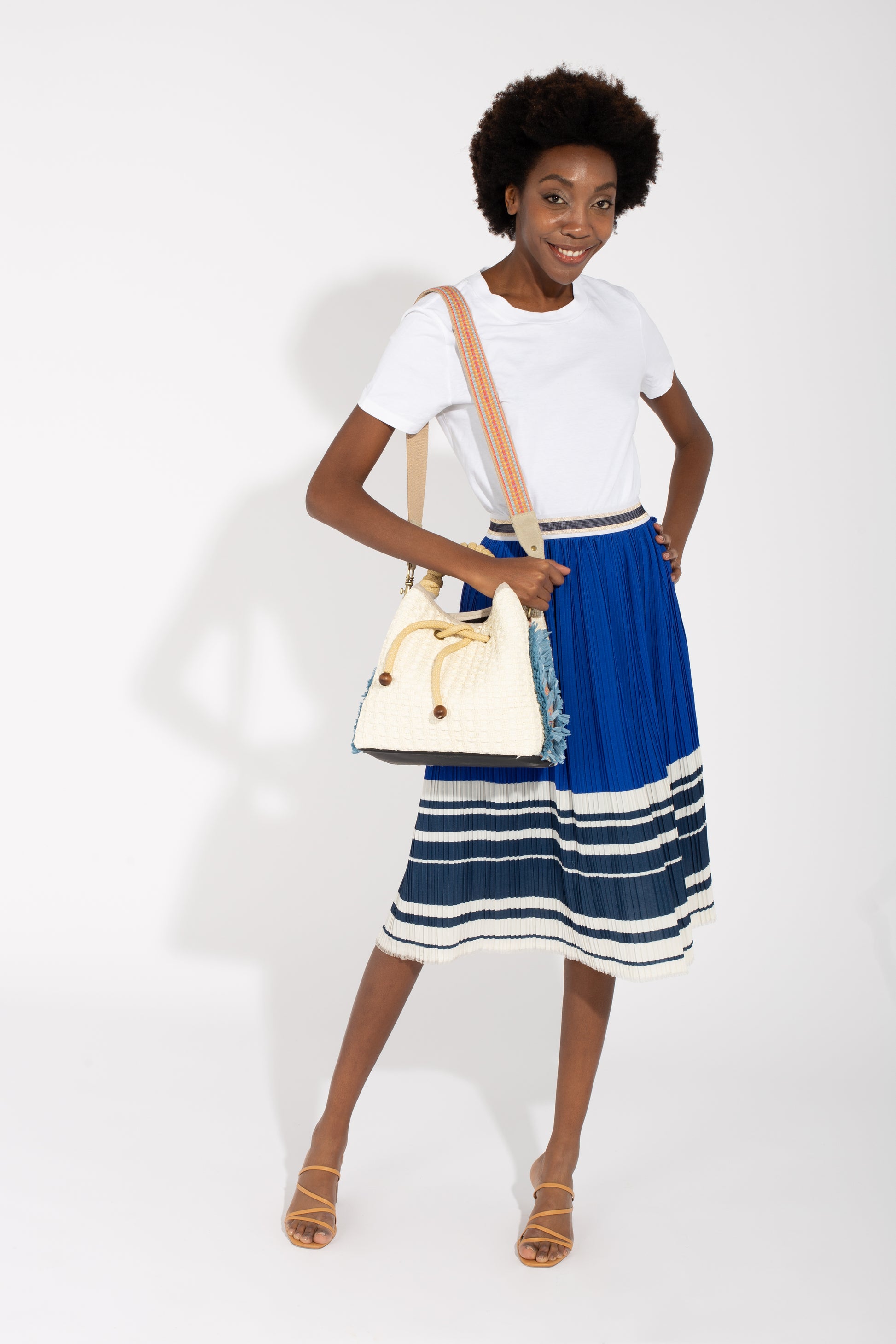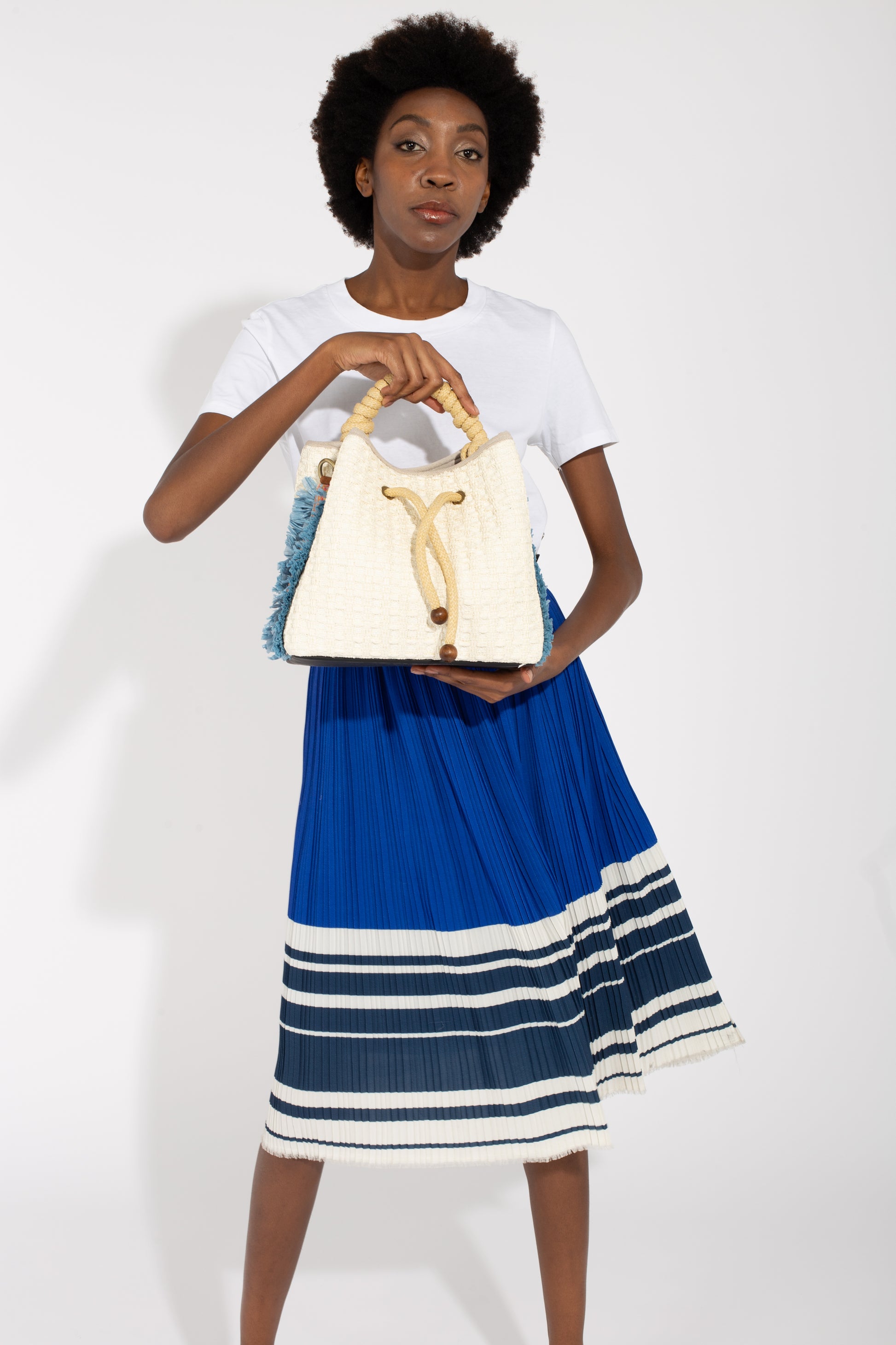 Cayos Fringe is a top handle bag made in woven raffia in the workshop of Viamailbag in Tuscany.