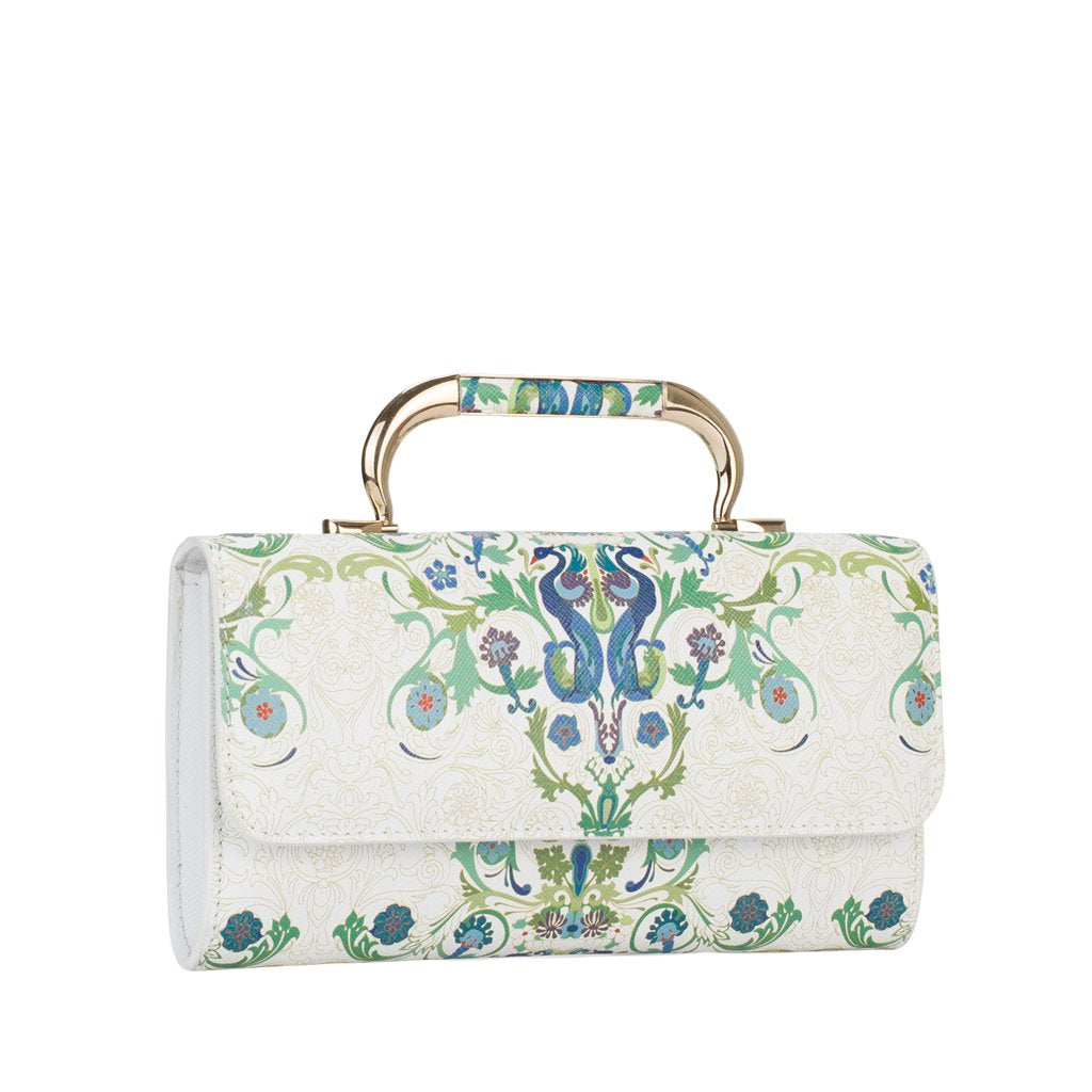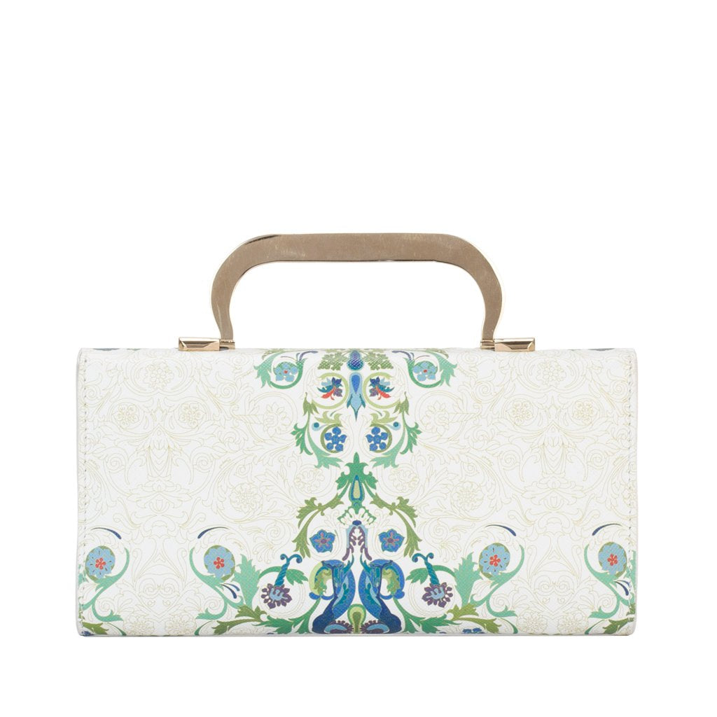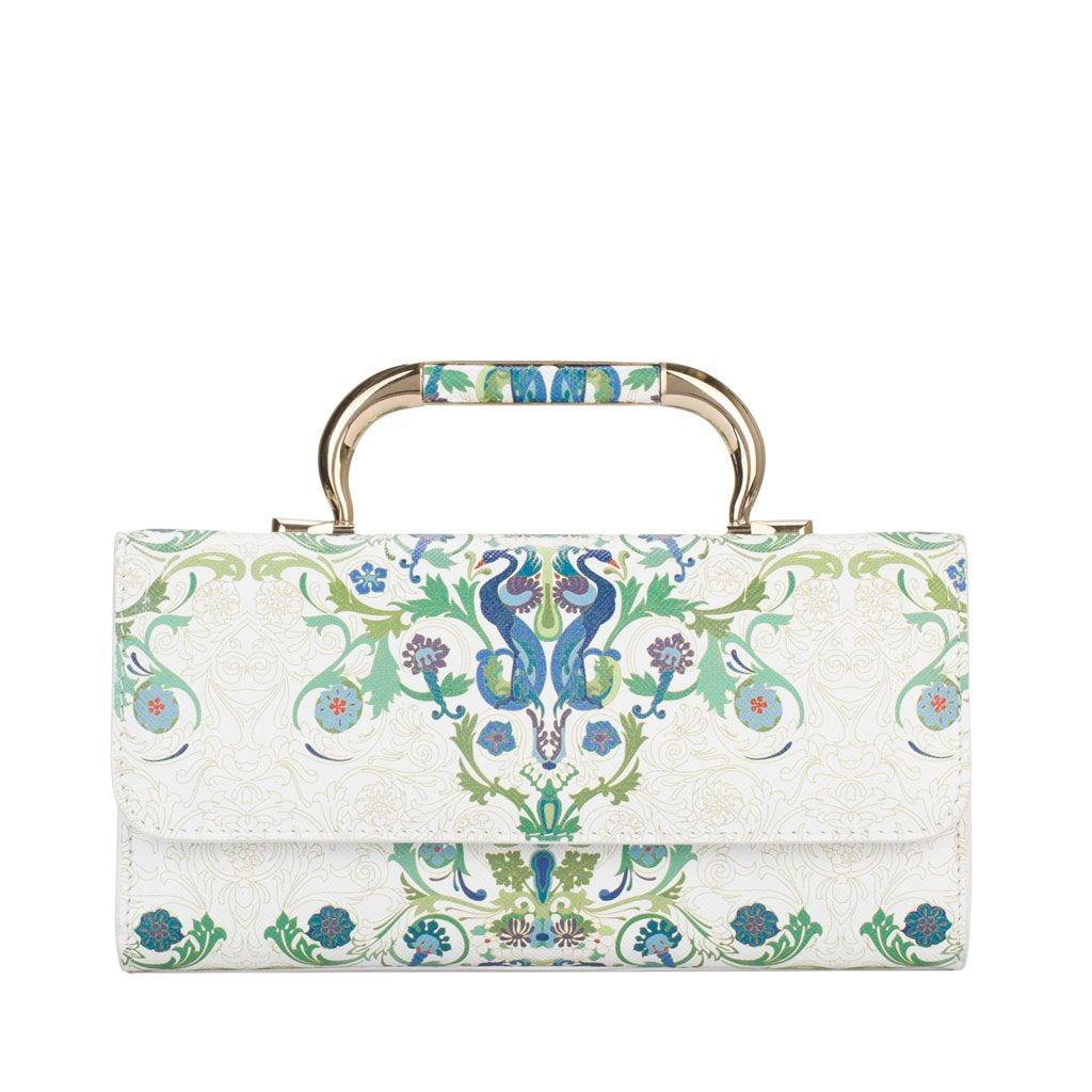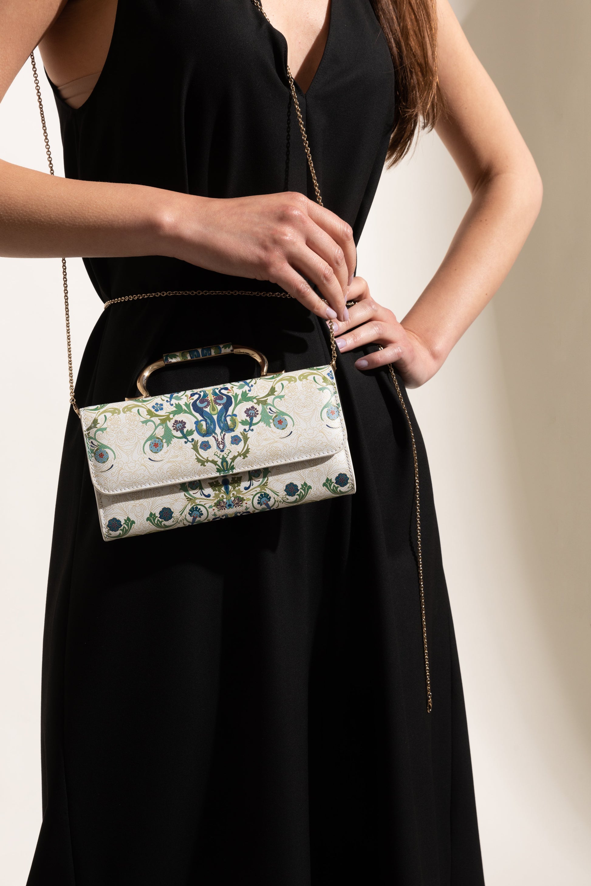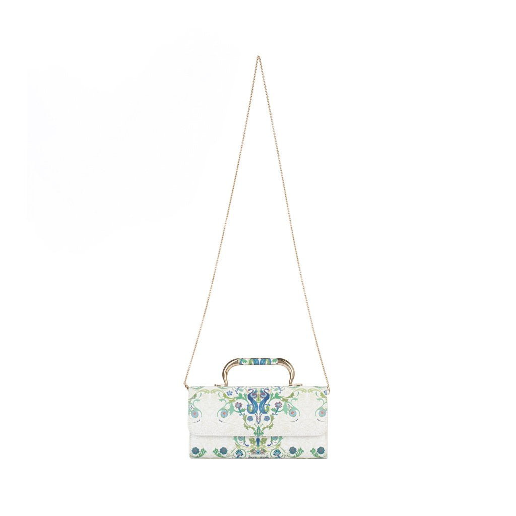 Celebrity Long is a top handle bag crafted by Sapaf Atelier in Florence, Tuscany. A stunning display of Italian craftsmanship, this bag features an intricate multicolor floral pattern and rose gold-toned hardware. For a hands-free option, simply attach the chain strap and sling across your shoulder. Perfect for either a casual lunch or fancy night out, Celebrity Long will definitely steal the show no matter the occasion!