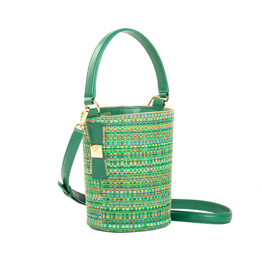 Colorful is a bucket bag made of cotton and leather crafted by Vanessa Saroni.