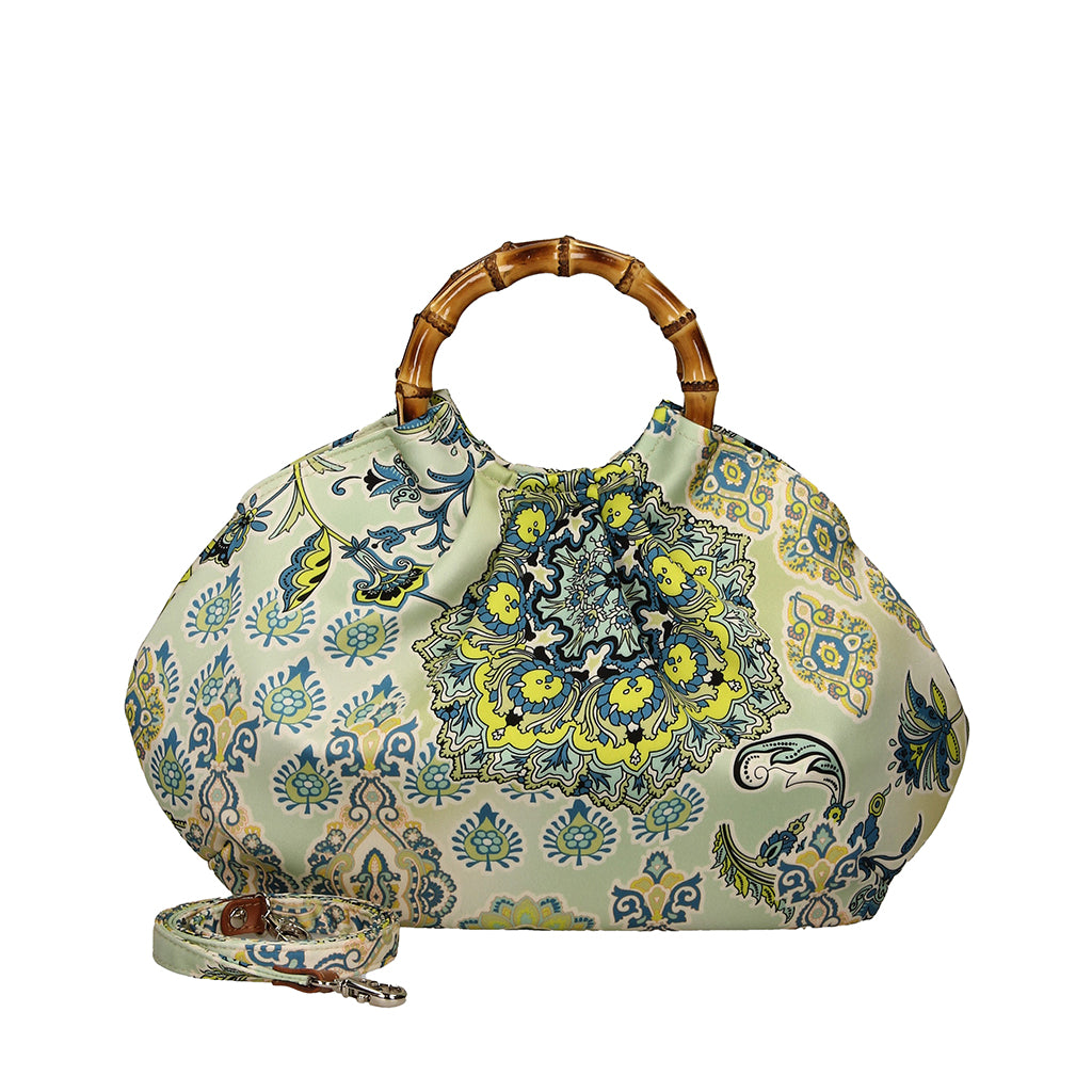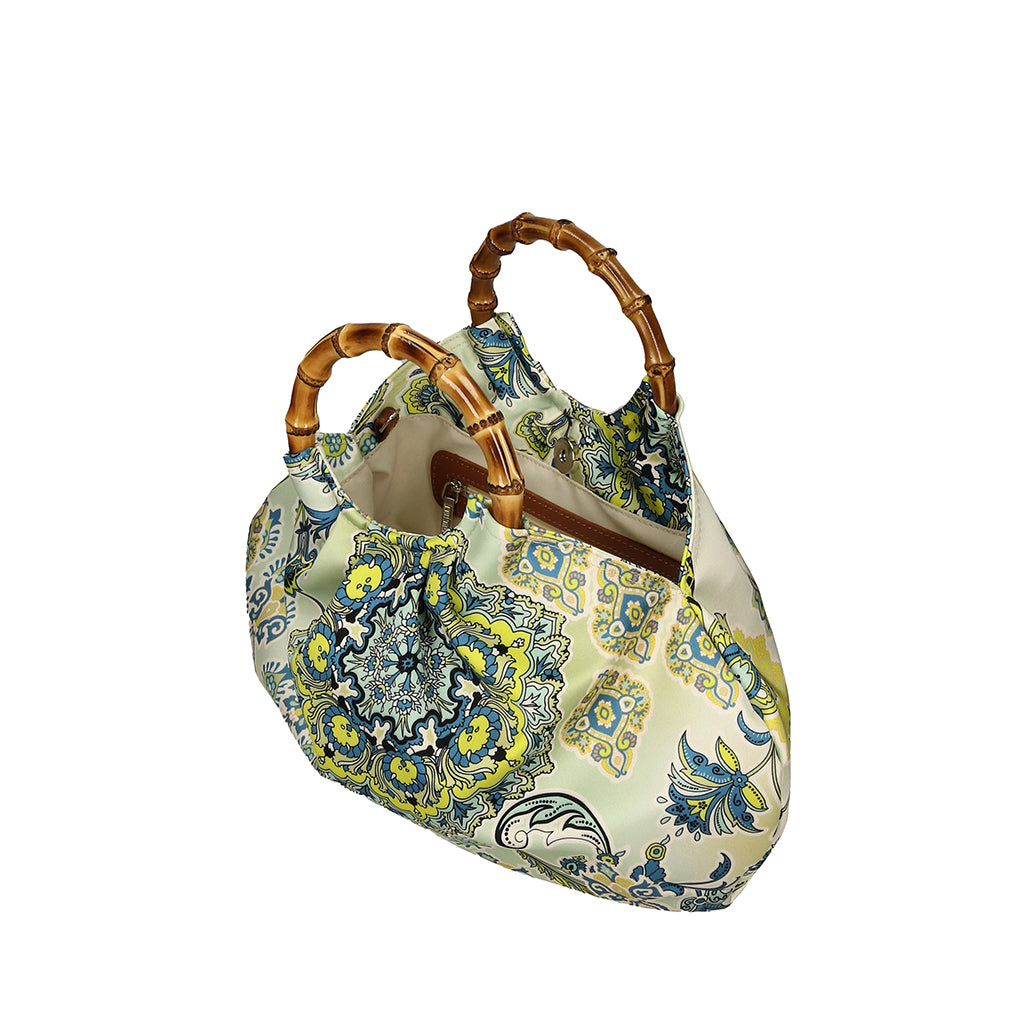 COROLLA GRANDE is a round shaped handbag developed with a satin touch printed fabrics, calf leather trimmings and real bamboo wood handles- 100% Made in Italy