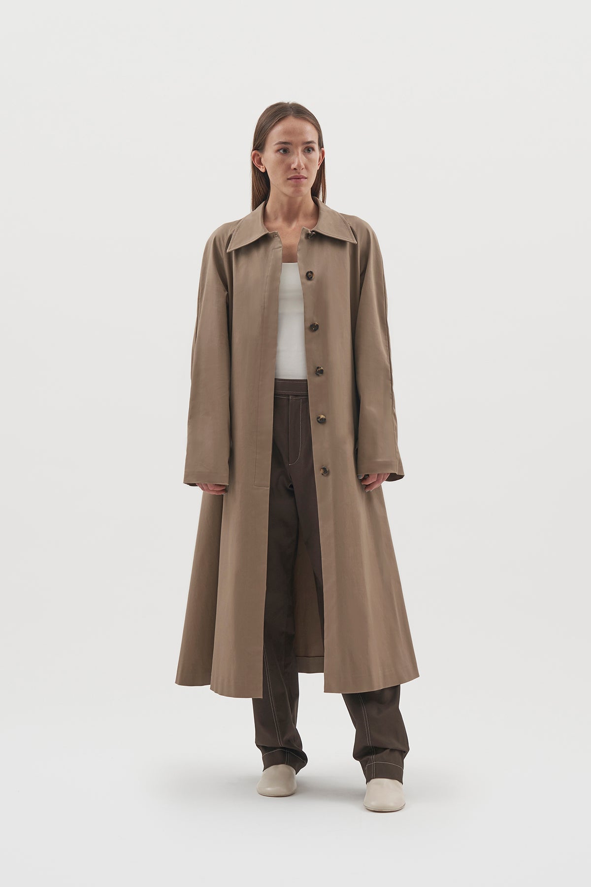 Raglan trench coat with gathers at back, composed of cotton made in Florence by Armonï Studio.