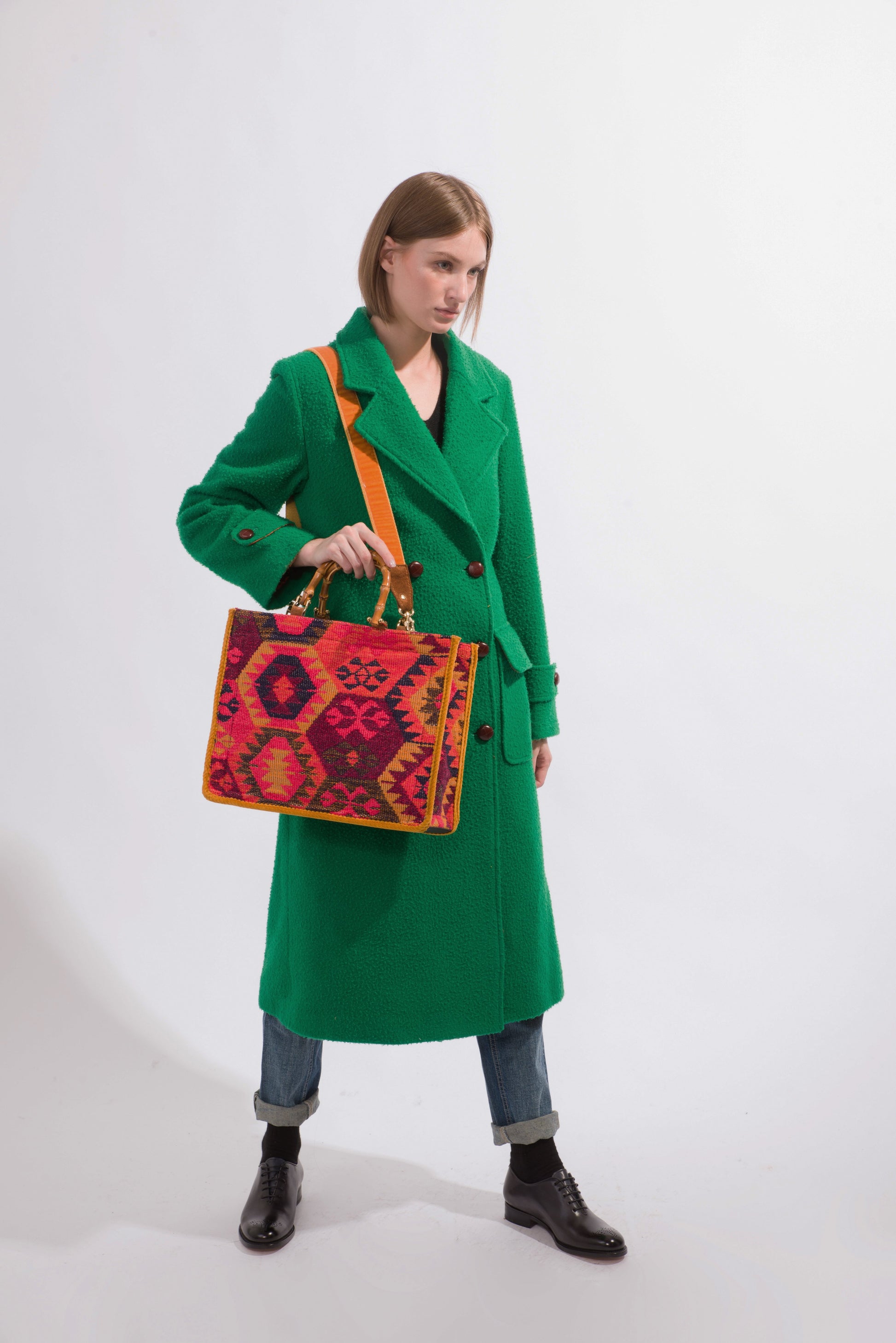 Davos Kilim is crafted by the expert artisans of ViaMailBag in Empoli, Tuscany. This box tote bag made of jacquard kilim boasts plenty of space on the inside along with a colorful exterior design and bamboo handle. Davos Kilim is not only chic, but versatile too featuring a detachable velvet shoulder strap.