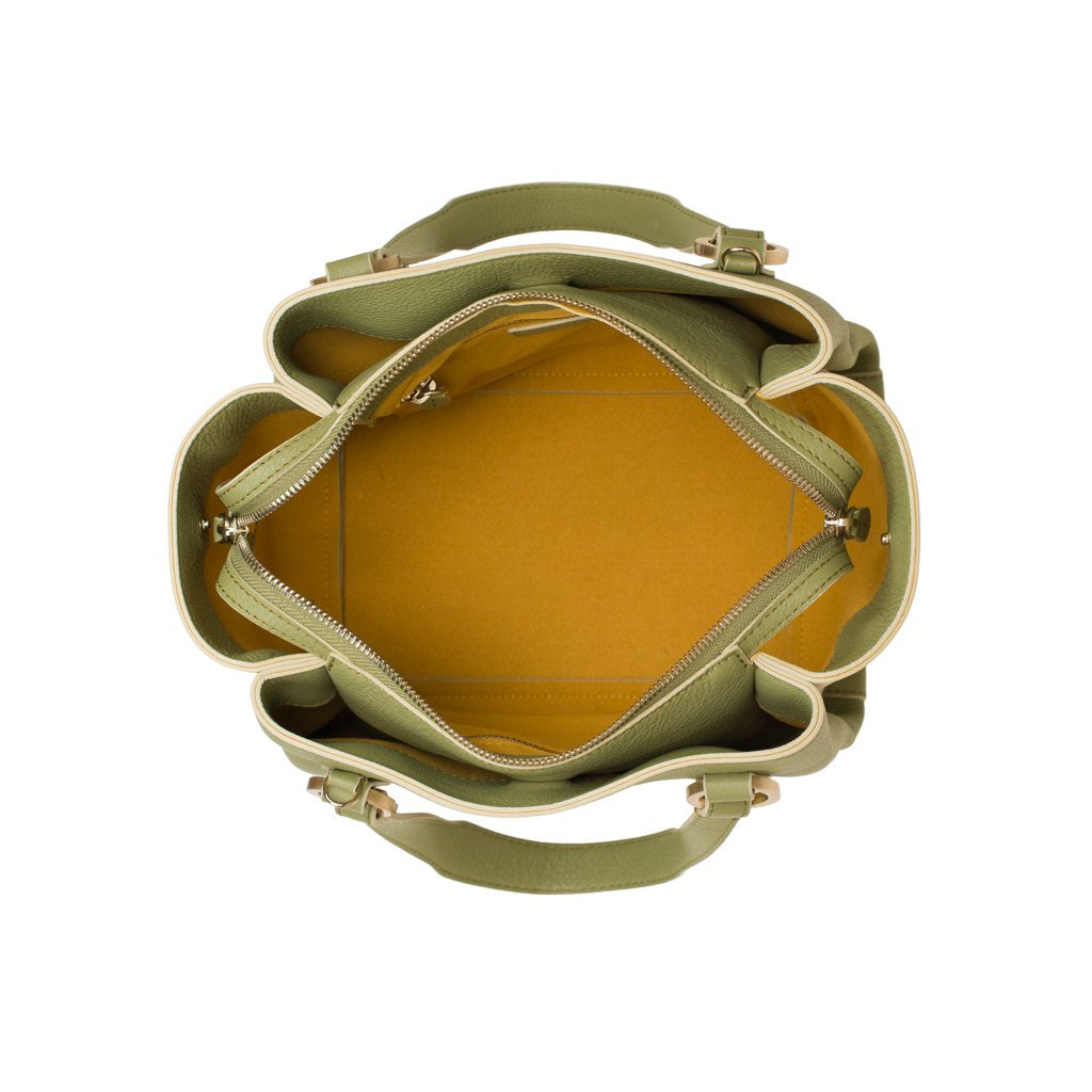 Fleur is a tote bag crafted by Ireri. Made of soft calfskin leather, its name suggests the actual shape of the object, exhibiting soft lines and multiple compartments which, if seen from above, remind of a floral silhouette. The inside, in a bright suede, is spacious and soft to touch. Two additional compartments, on both sides of the main body and closed through a hidden magnet, make it a very functional bag, also thanks to the detachable strap provided.