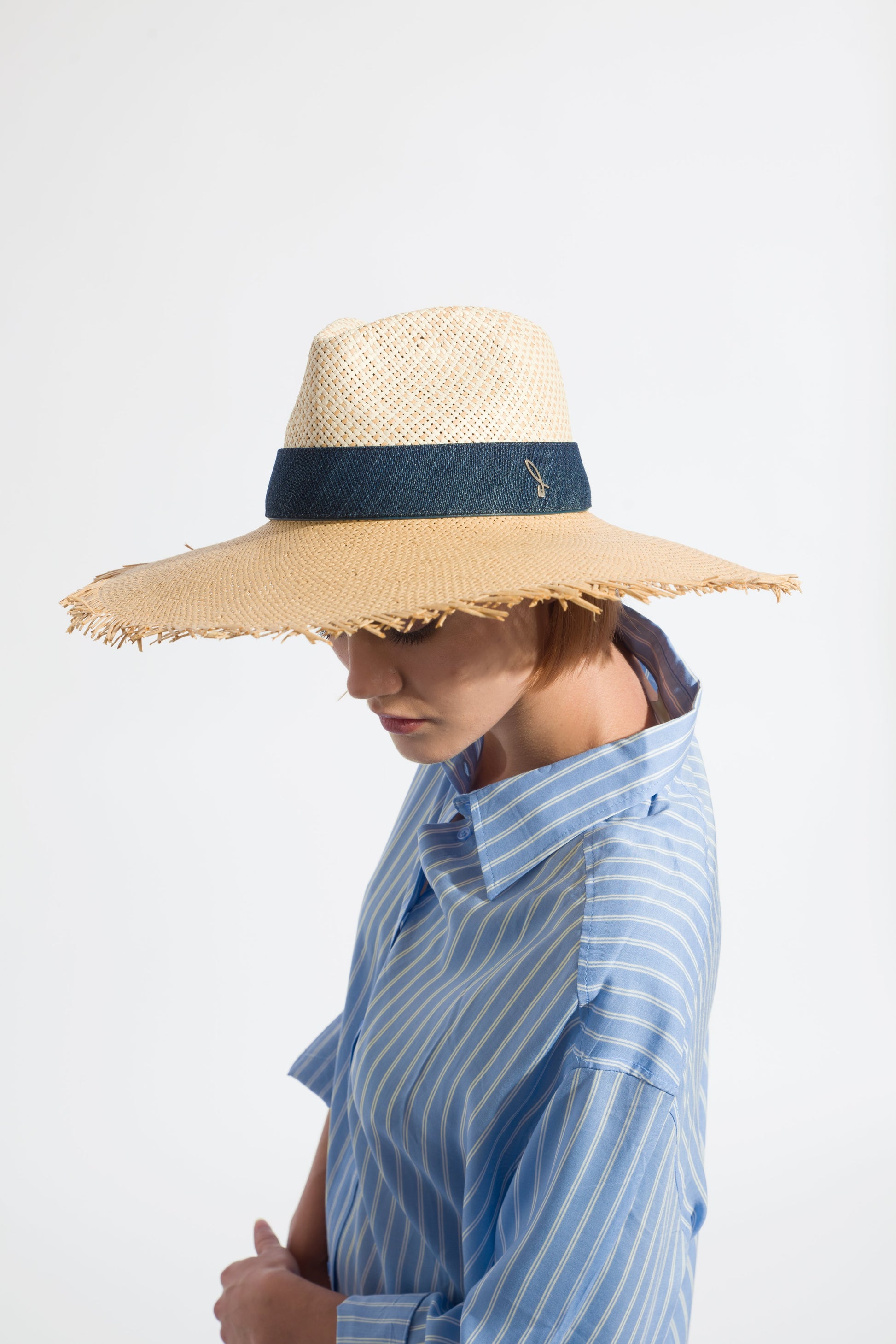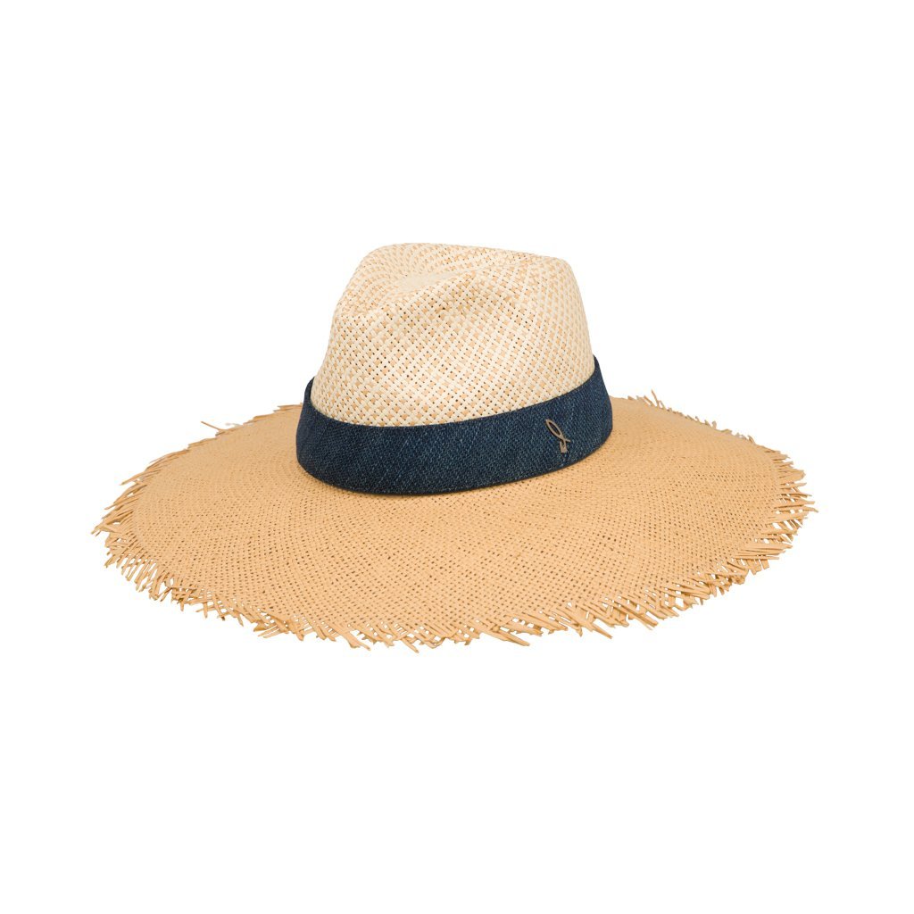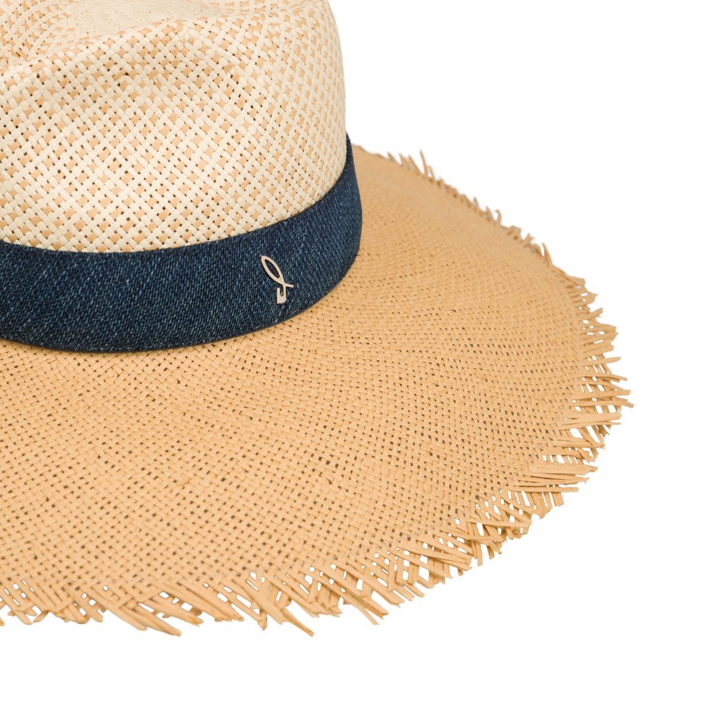 Labuan is handcrafted by the historic weaving artisans of Doria 1905 in the Salento area of Apulia. This woven hat is made of a cellulose fiber called papier, obtained from recycling paper. Labuan boasts a two-tone colorway and deep blue denim belt adorned with a brass D logo. The slight fringes along the edges also make Labuan a fashionable and fun sun accessory.