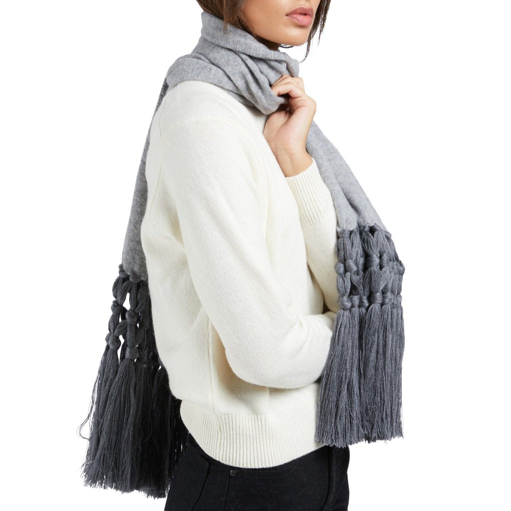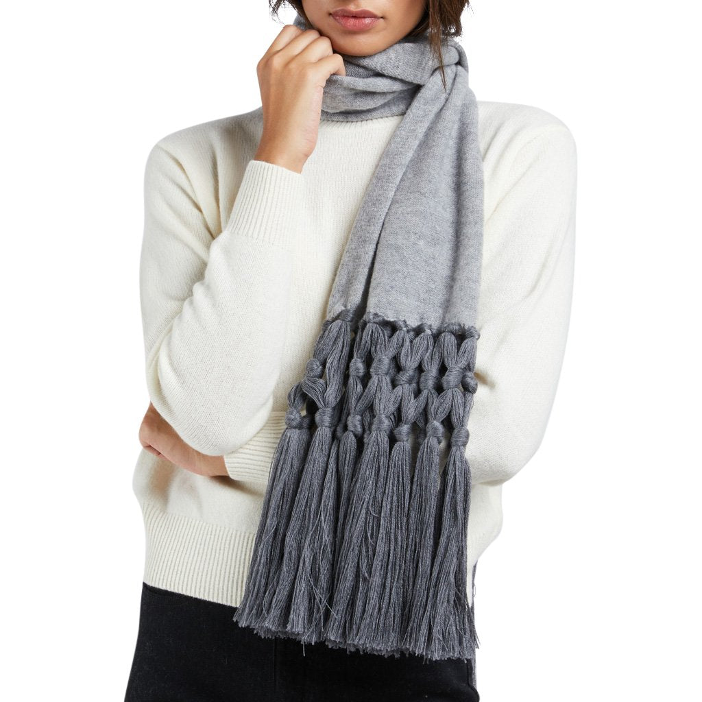 Miris is a scarf knitted by Nicki Colombo in Badoere di Morgano. This sharp scarf is luxuriously made of cashmere and merino wool for the softest and most comfortable feel and features hand knotted fringes to finish your winter look. - 100% Made in Italy