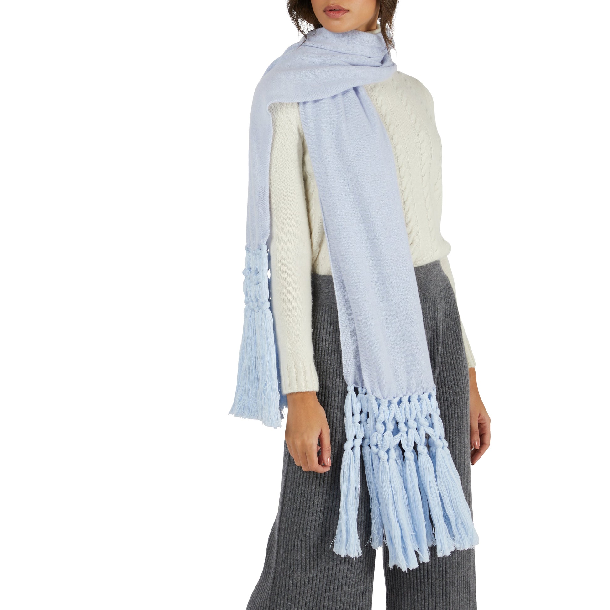 Miris is a scarf knitted by Nicki Colombo in Badoere di Morgano. This sharp scarf is luxuriously made of cashmere and merino wool for the softest and most comfortable feel and features hand knotted fringes to finish your winter look. - 100% Made in Italy