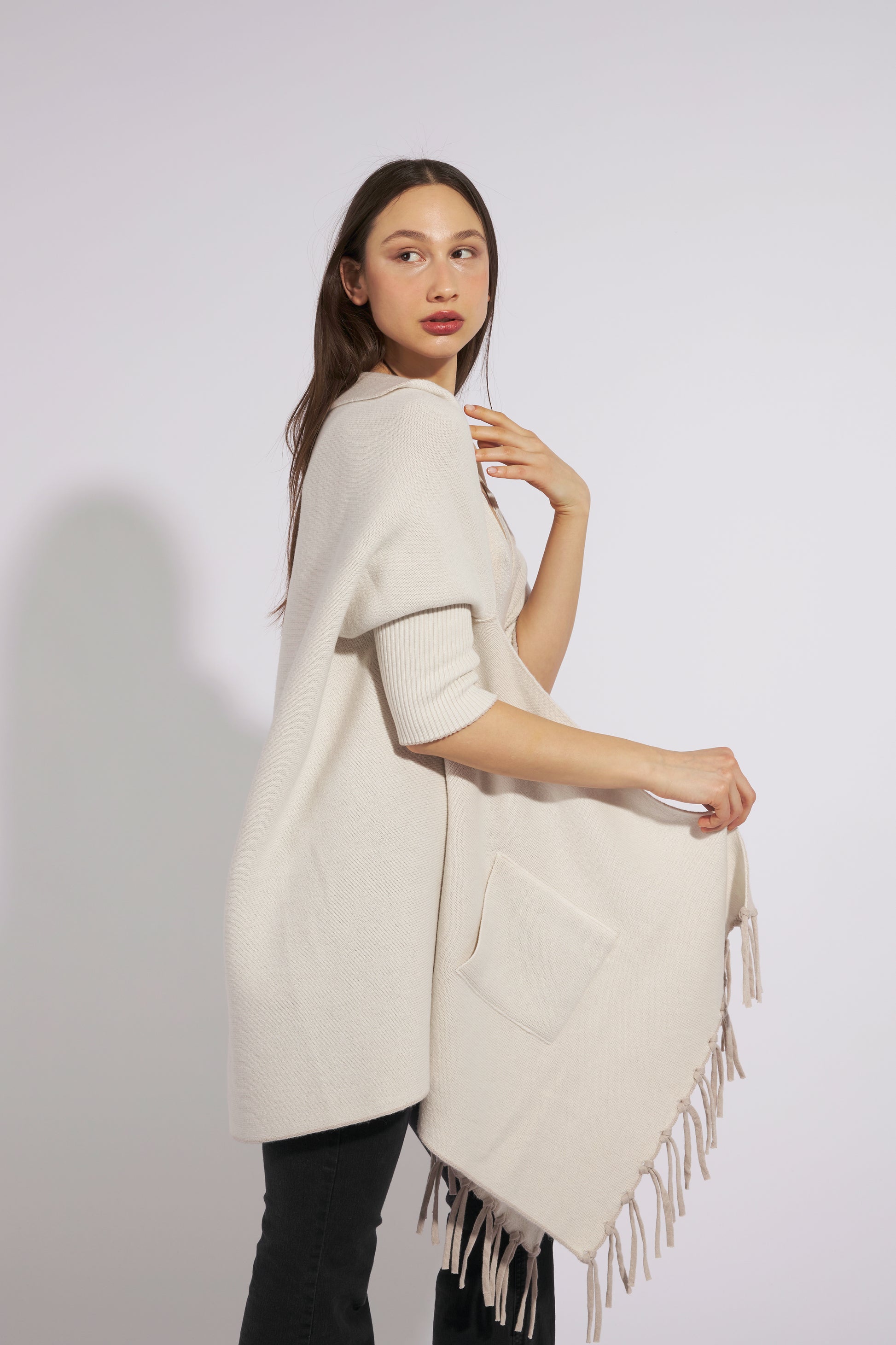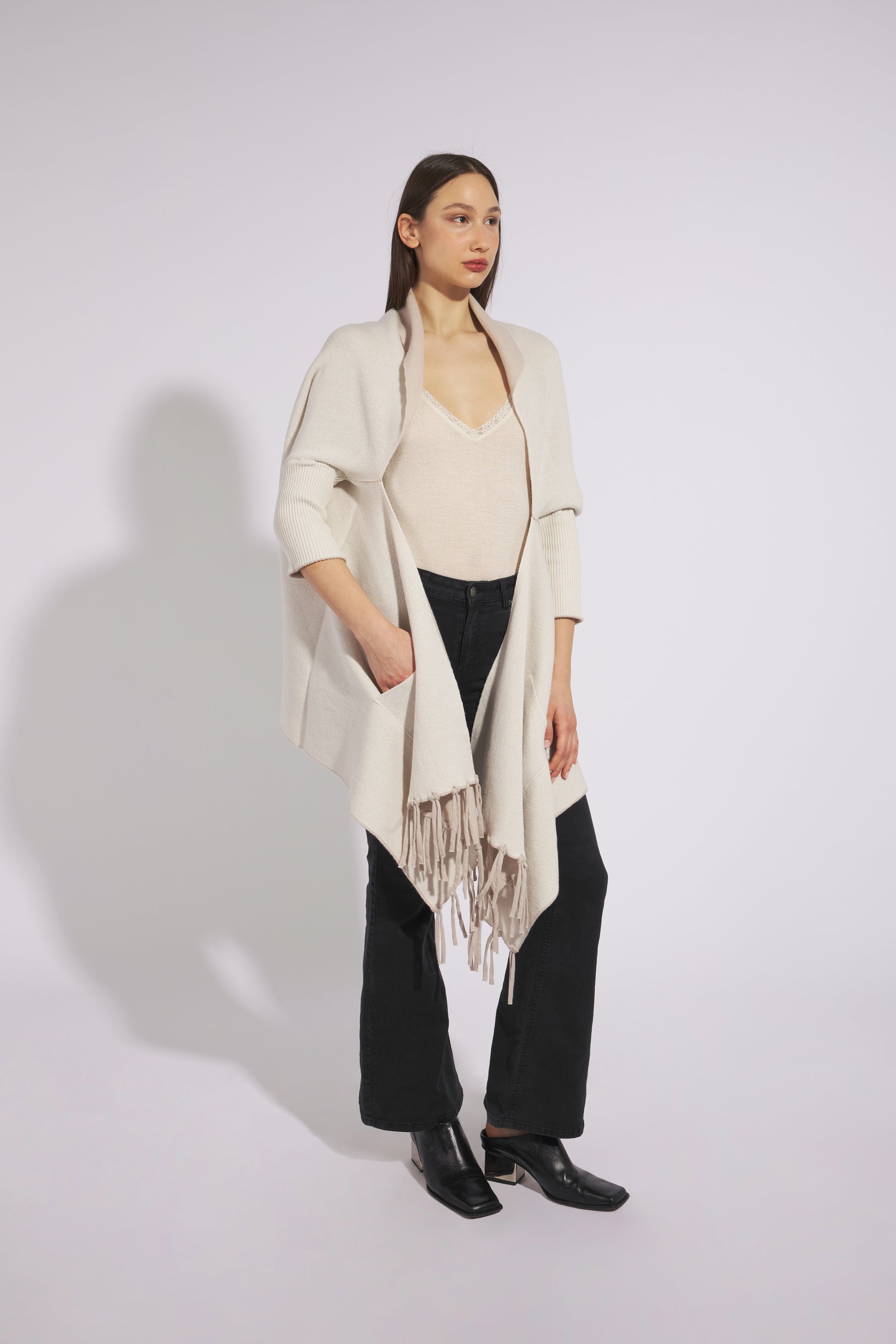 Neela is a reversible cape made of cashmere crafted by Curling Collection. Features decorative fringe on the bottom.