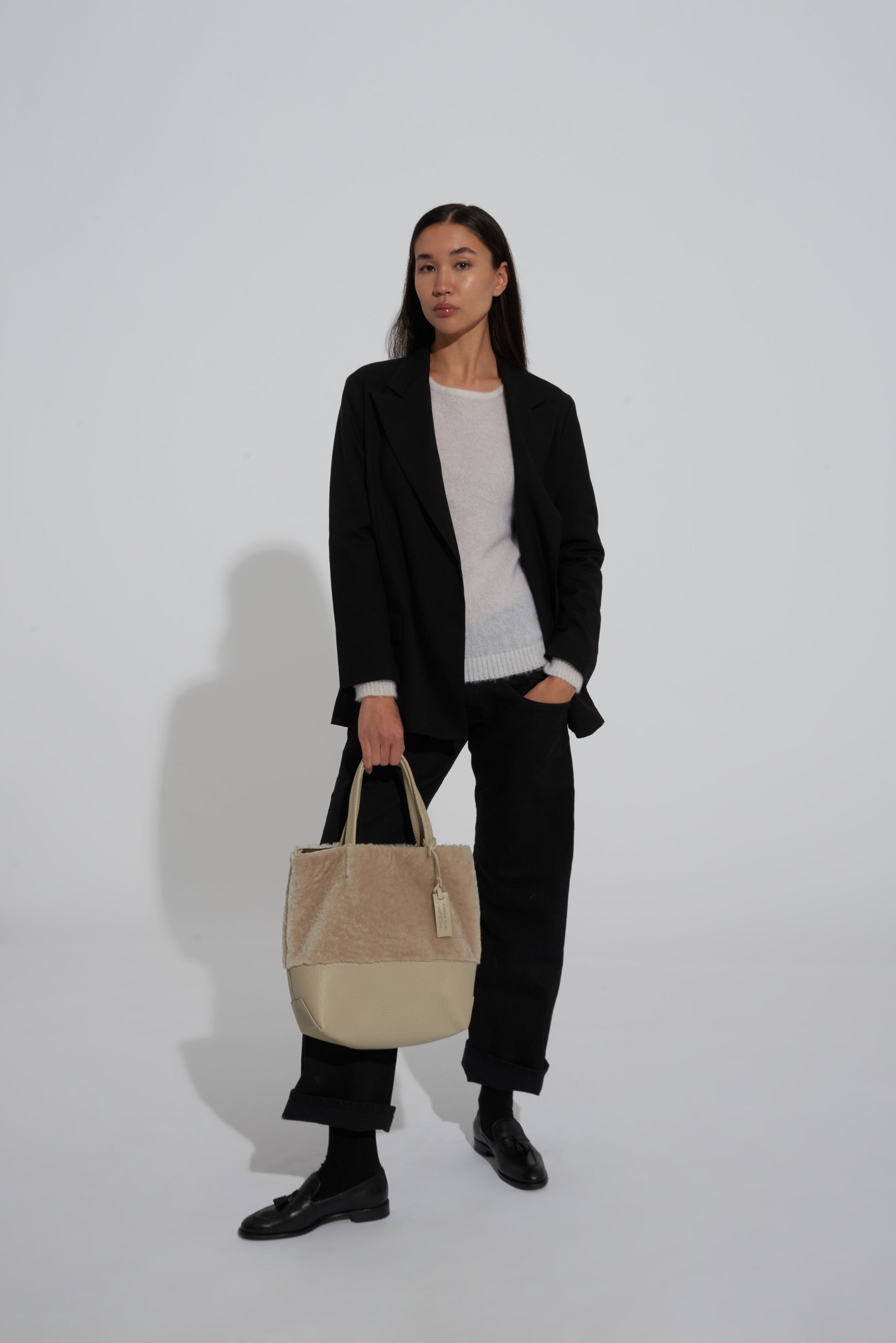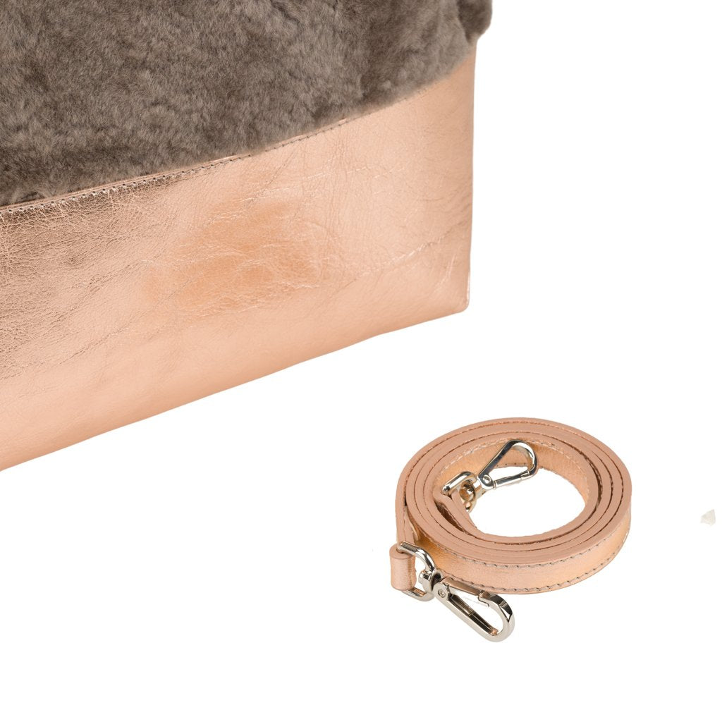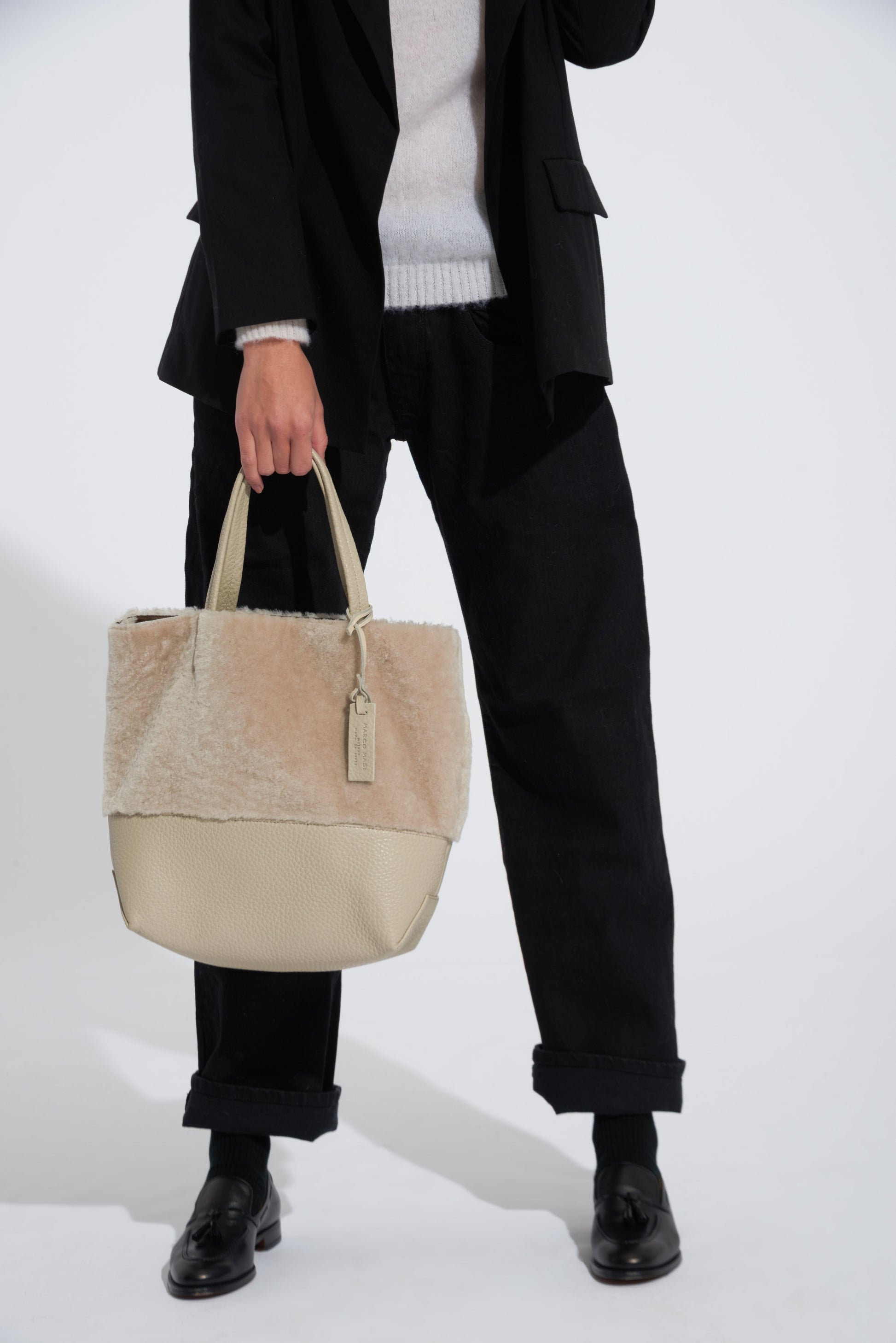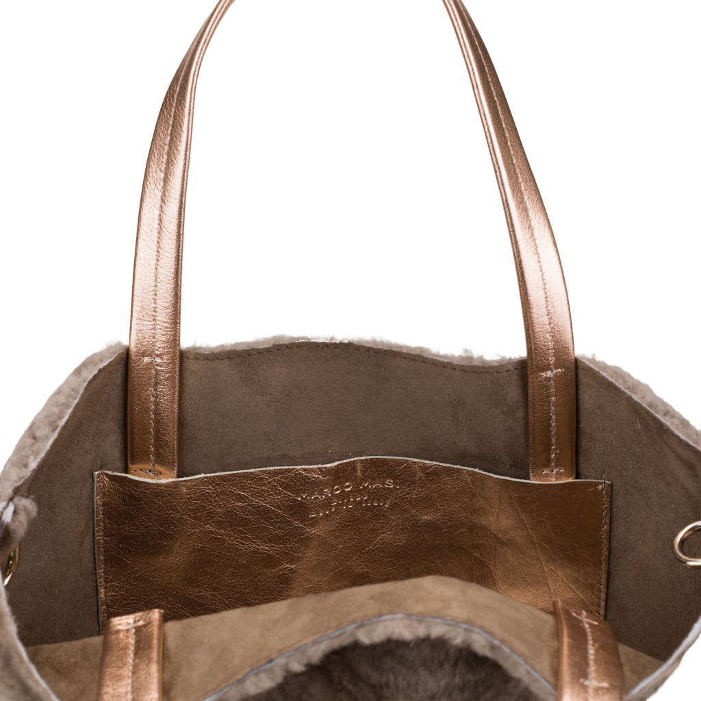 Noella is a tote bag crafted by Marco Masi in Milan, Lombardy. This tote is made of both sheepskin and calfskin leather, the ultimate cozy chic combo for your winter looks. To turn Noella into a shoulder bag, simply attach the included strap.