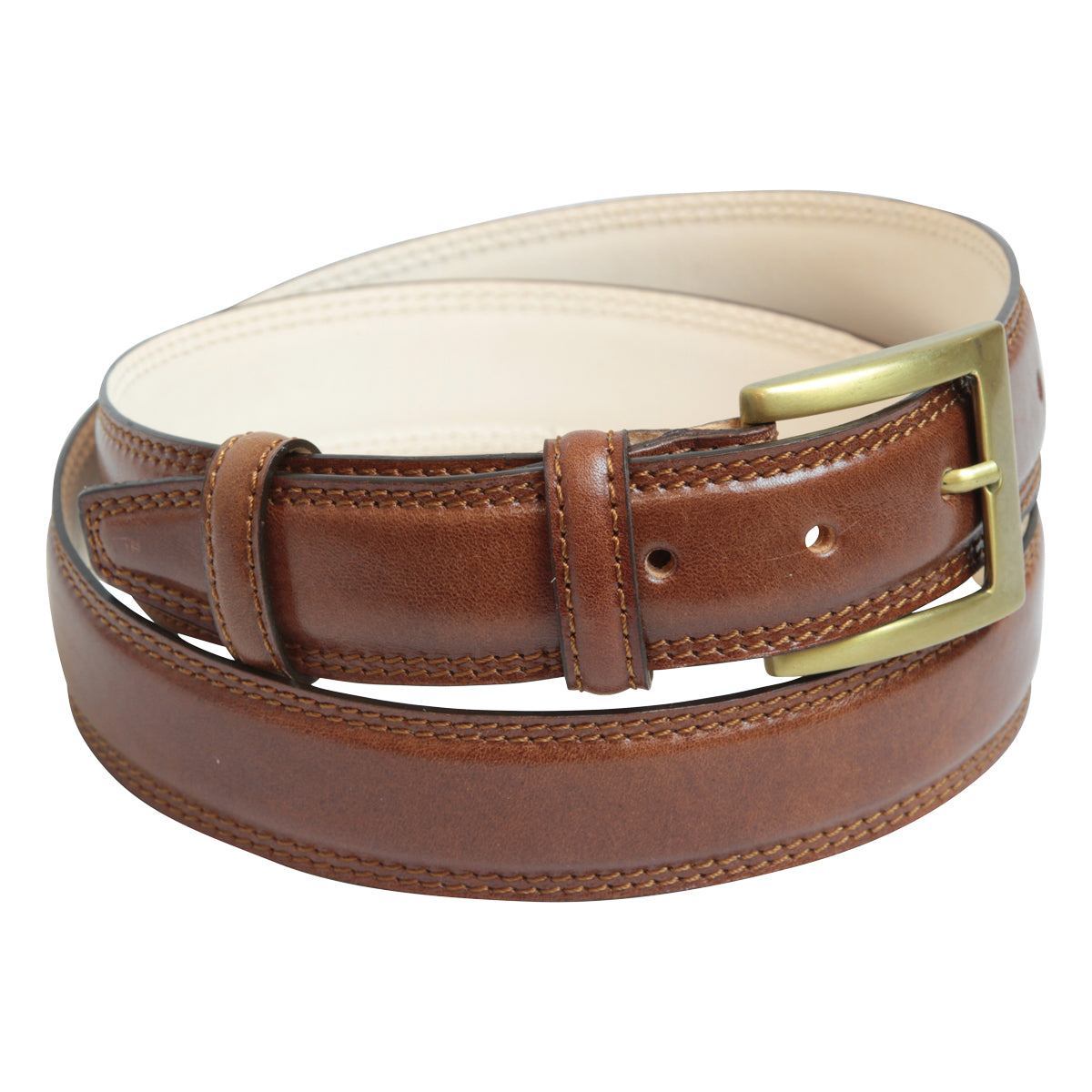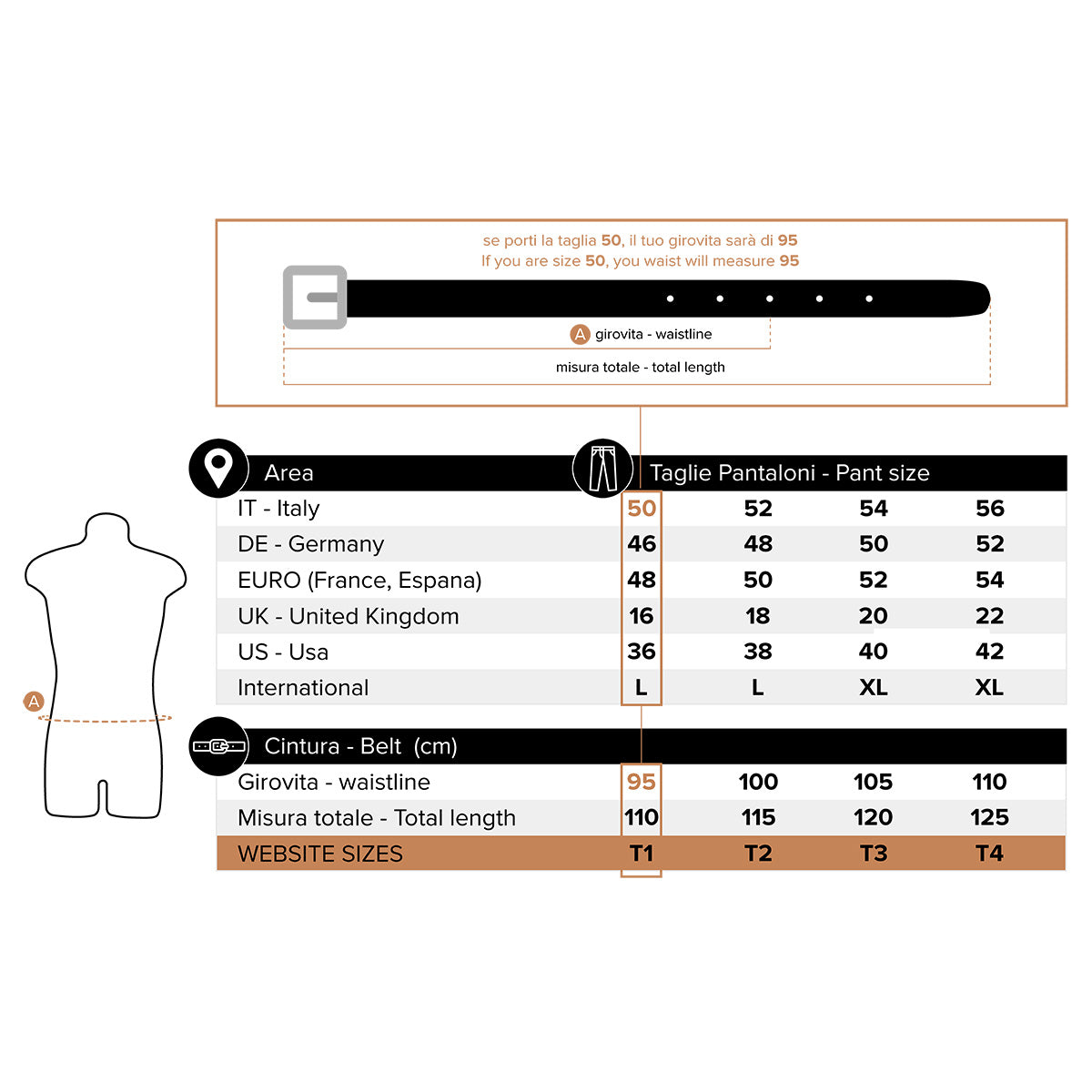 Full-grain calfskin leather belt with double stitching. Wide 1.38". Backside in top grain leather (nubuck) first quality, very durable ; suitable for a daily use. How to choose the size: - if you have a belt that you regularly wear, you can measure the distance between the main hole used and the end of the buckle, this is your waist size. I.e. if the distance is 102cm (40 in.) you need to buy a T3 (when your waistline in in the middle between two sizes always choose the longer one, as you have two extra holes up and down to fit your size)- If you haven’t a belt you can measure the waist of your pant and/or follow the guide above to convert pants size in waist-size (or viceversa).The waist length is shorter than the total length of the belt of about 15cm (6”), as from the center hole to the edge of the belt there are about 15cm (6”). So, if you buy a belt waist size 38” (100cm) the total lenght will be 115cm (45”)- Made in Italy