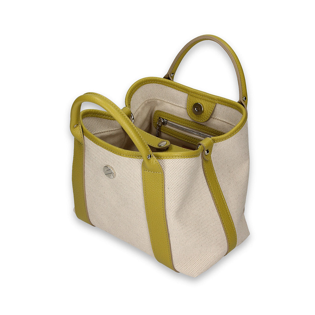 ONDINA B is a small flared 2 Way bag developed with the traditional Panama cotton canvas and calf leather trimmings.- 100% Made in Italy