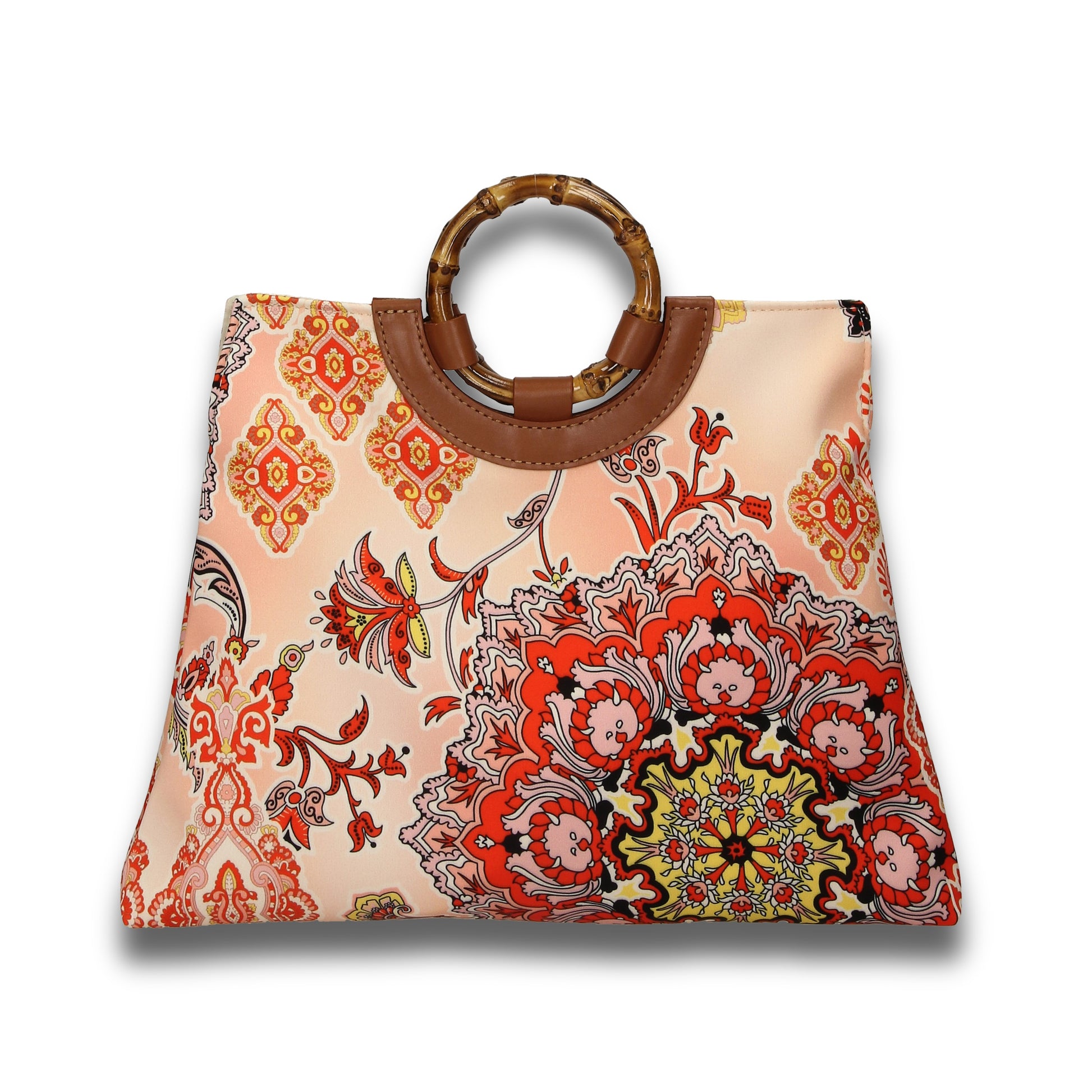 PAGODINA is a flared shaped handbag developed with a satin touch printed fabrics, calf leather trimmings and real bamboo wood handles.- 100% Made in Italy