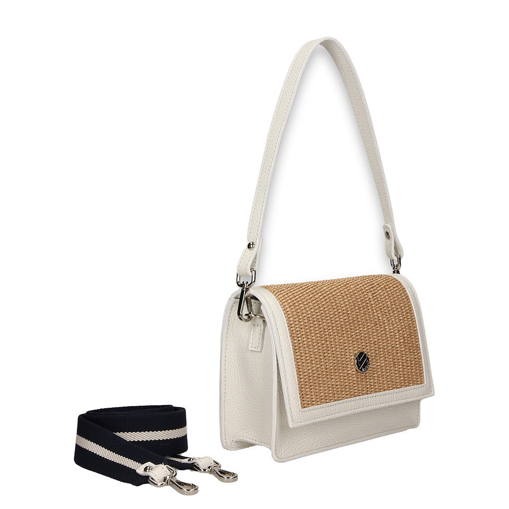 RIVIERA B is a mesh technoraffia squared shoulder bag with calf trimmings and matching marine style longer shoulder tape- 100% Made in Italy