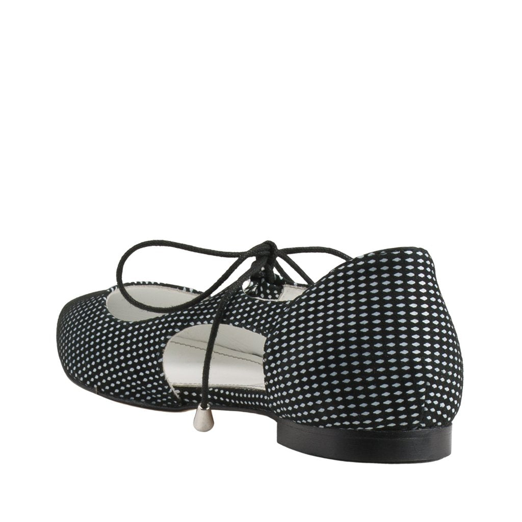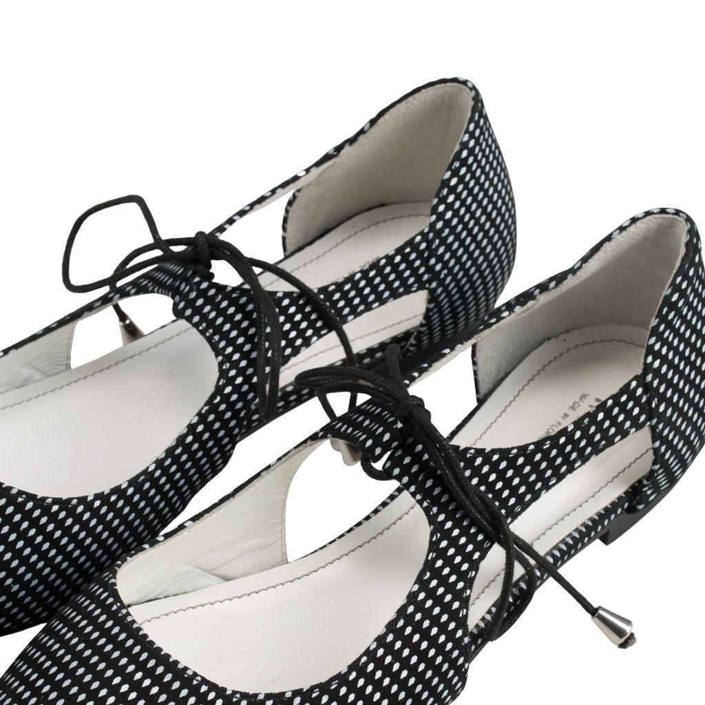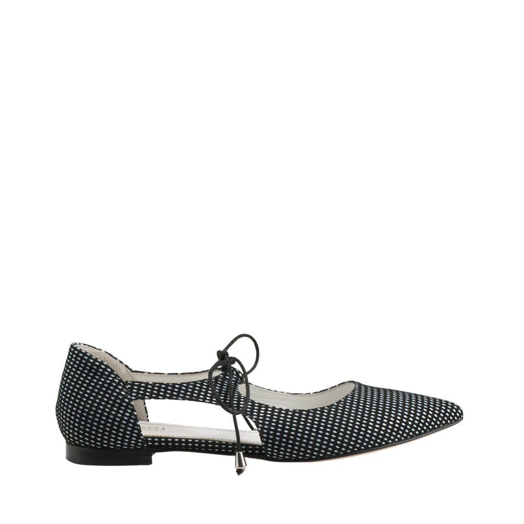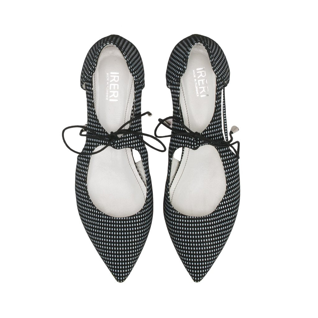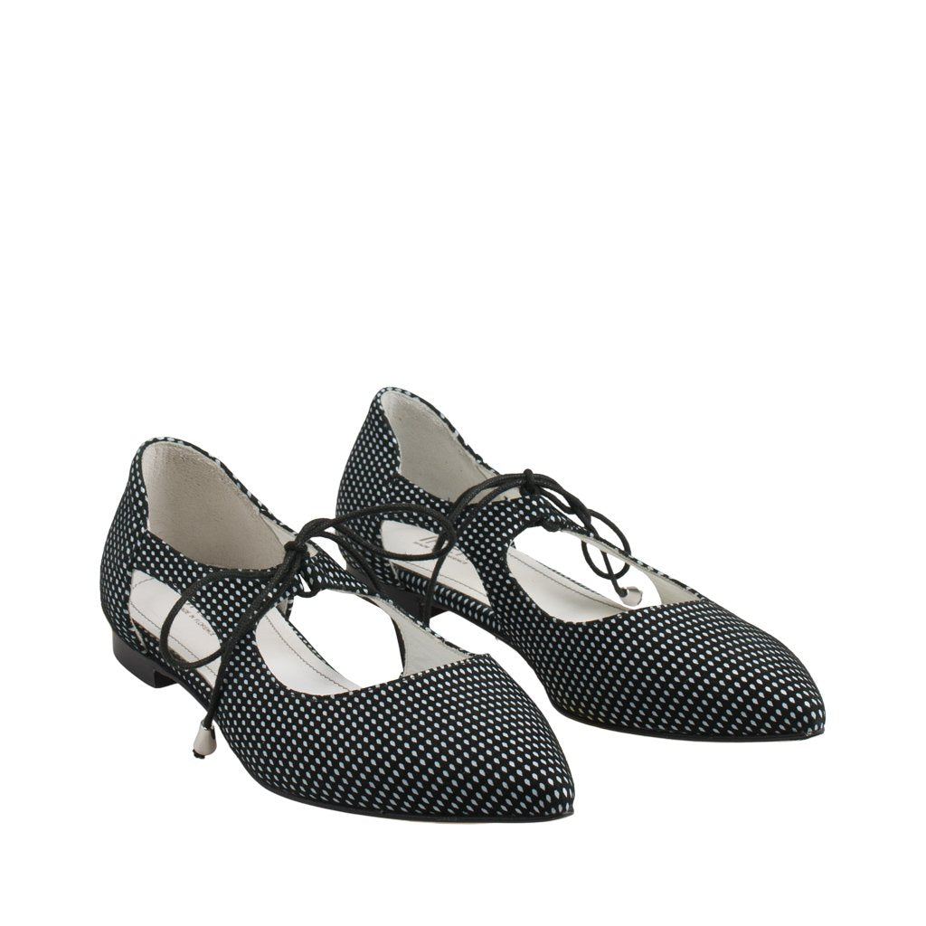 Silvia is a pair of shoes crafted by the leather experts of Ireri in Florence, Tuscany. These lace-up pointed flats are made of both suede and leather, rendering them both comfortable and stylish. With a black and white polka dot pattern, it's easy to match Silvia with virtually any outfit.