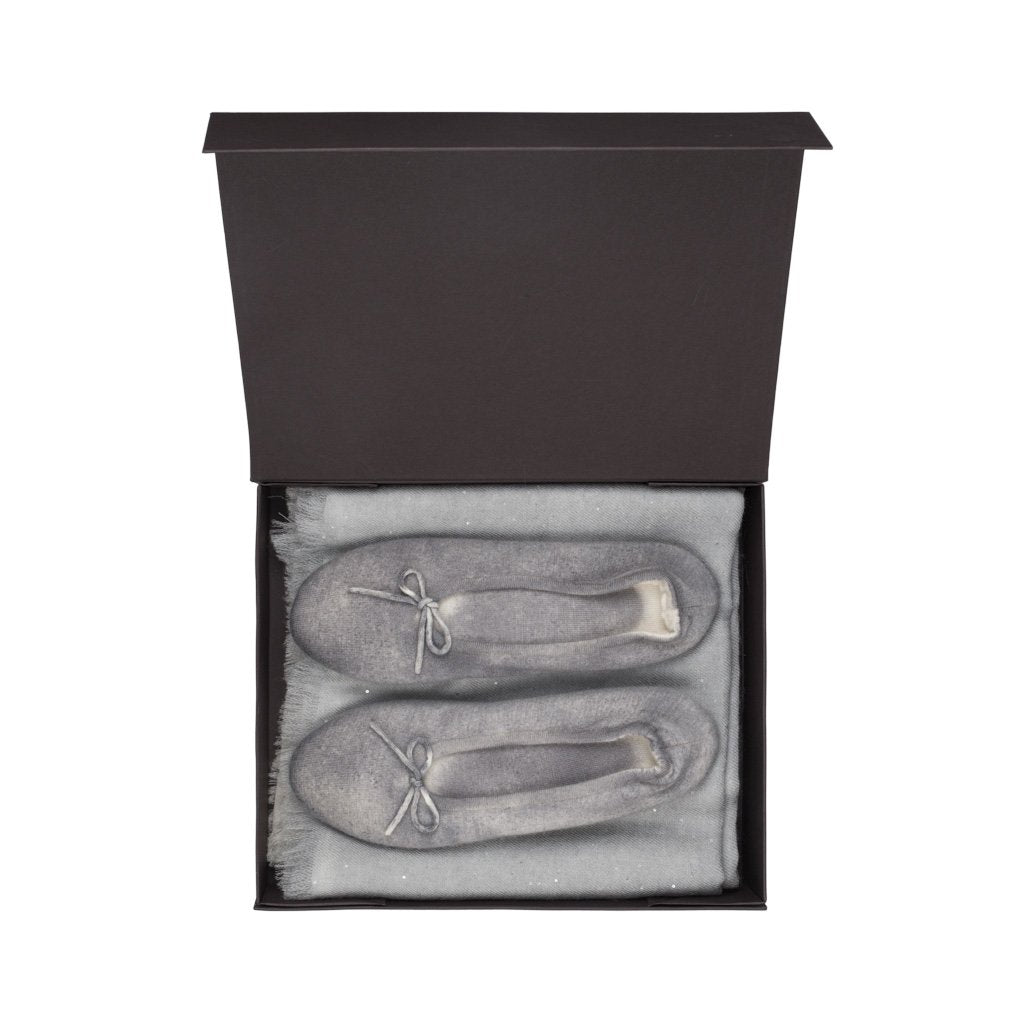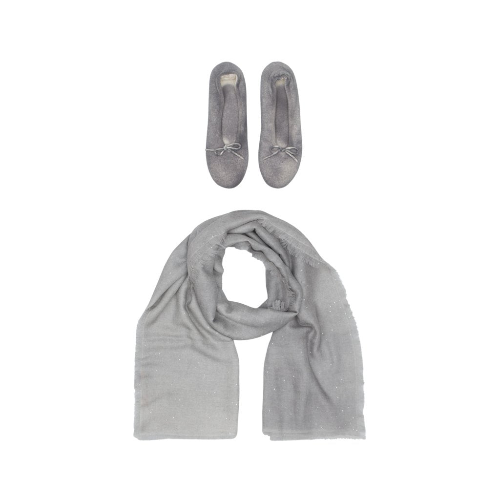 Starglow is a travel set of matching cashmere slippers and handwoven scarf made by Ama Pure in Carpi, Emilia-Romagna. Made with 100% cashmere, both slippers and scarf are luxuriously soft and ultra-comfortable.
